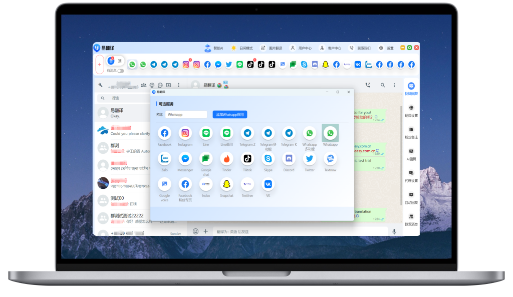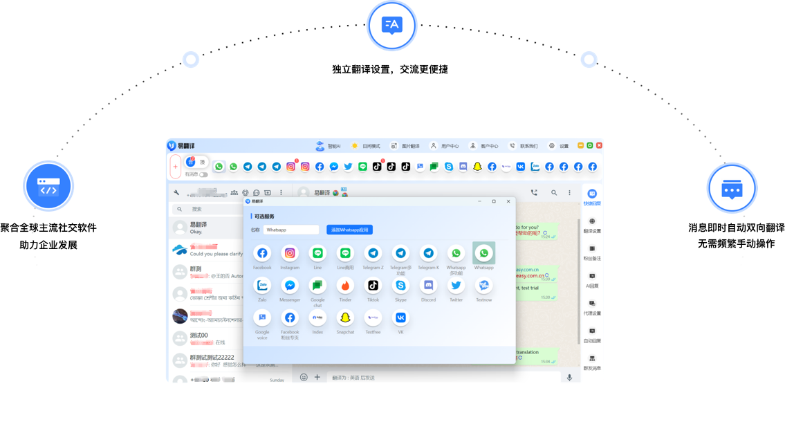 易翻译支持对接 WhatsApp、LINE、Zalo、Telegram 等主流社交软件,帮助企业实现多平台统一翻译与客服协同。